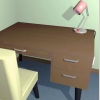 Sur le petit meuble avec quatre tiroirs, on peut avoir une vue de biais en cliquant un peu à gauche. En ouvrant le deuxième tiroir, on trouve une télécommande. Sans pile bien entendu, sinon ce ne serait pas drôle.
